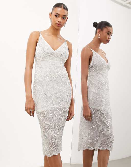 ASOS EDITION – Kremowa sukienka midi z muszelkowym dołem zdobiona kryształkami i cekinami