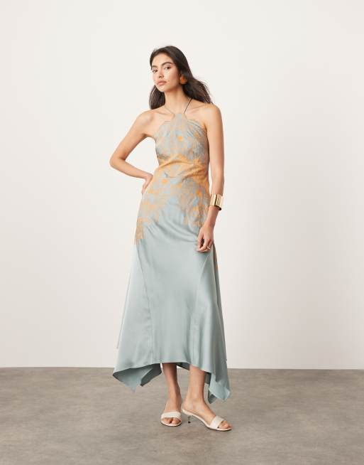 ASOS Edition – Niebieska satynowa sukienka midi z dekoltem typu halter, koronkową aplikacją, haftem i asymetrycznym dołem
