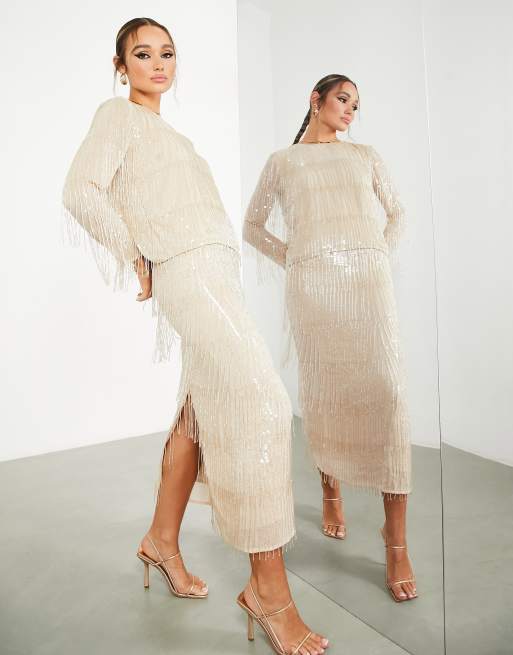 ASOS Edition – Pudroworóżowa spódnica ołówkowa midi z cekinami i frędzlami