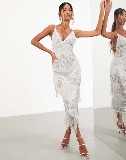 ASOS EDITION – Srebrna sukienka midi na ramiączkach ze zdobieniami i pastelowymi frędzlami