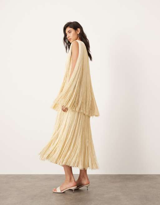 ASOS Edition – Warstwowa kolumnowa sukienka maxi z długimi frędzlami w maślanym kolorze