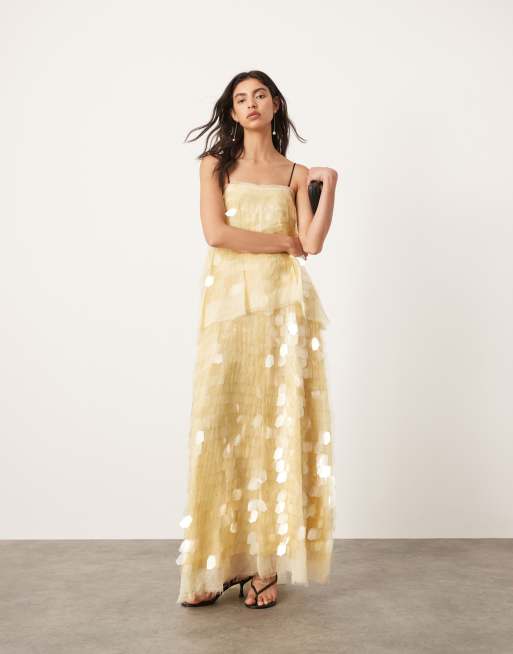 ASOS Edition – Zdobiona dużymi cekinami warstwowa sukienka maxi na ramiączkach w pastelowożółtym kolorze