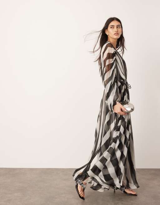 ASOS Edition – Zebrana w talii obszerna szyfonowa sukienka maxi w czarno-białe paski