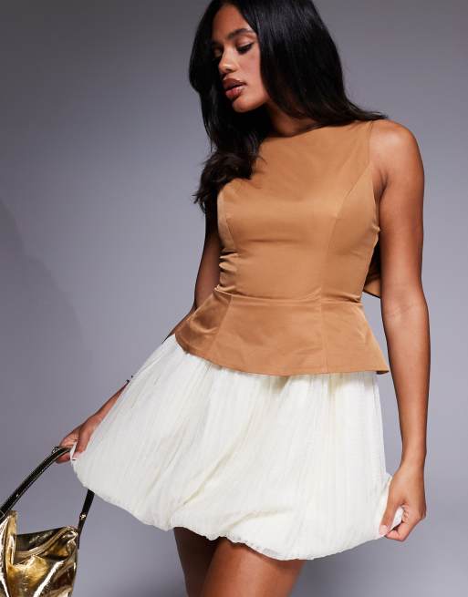 ASOS Luxe – Camelowa sukienka mini z modelującym topem z kokardką na plecach i spódnicą typu bombka