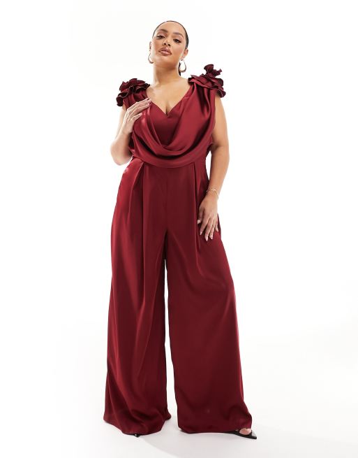 ASOS Luxe Curve – Bordoway, satynowy kombinezon z szerokimi nogawkami, głębokim dekoltem i ozdobnymi kwiatami