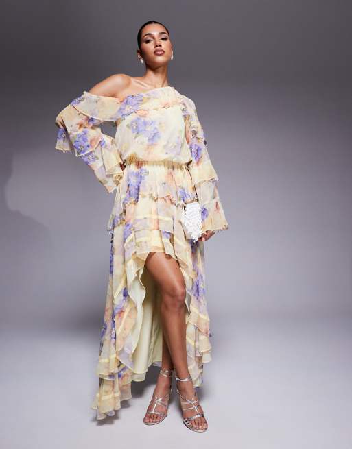 ASOS Luxe – Kremowa zdobiona perłami szyfonowa sukienka maxi w kwiatowy wzór