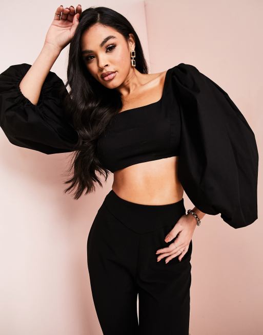 ASOS LUXE – Krótki czarny top z bufkami z bawełny