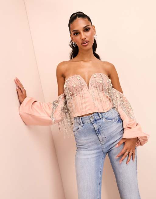 ASOS LUXE – Pudroworóżowy krótki top gorsetowy z długimi rękawami i głębokim dekoltem