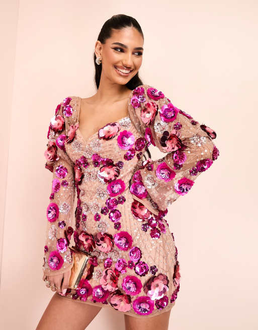 ASOS Luxe – Różowa zdobiona kwiatkami sukienka mini z bufkami