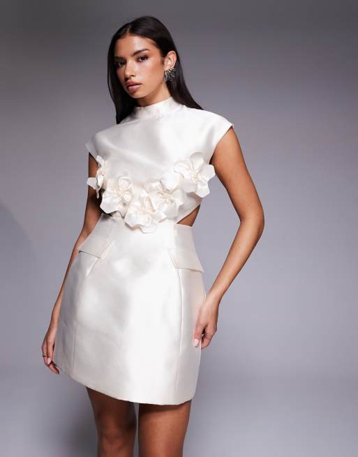 ASOS Luxe – Usztywniana satynowa sukienka mini w kremowym kolorze z bukiecikami