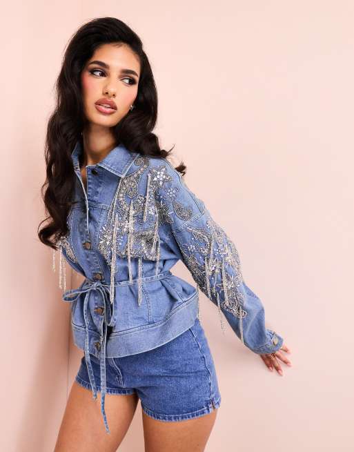 ASOS Luxe – Wiązana w talii niebieska kurtka jeansowa ze zdobieniem