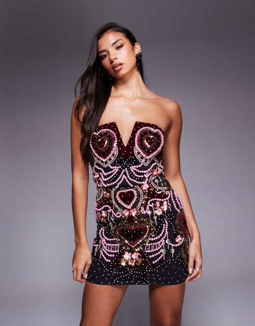 ASOS Luxe – Zdobiona perłami ze wzorem w serca aksamitna sukienka mini z odpinanymi ramiączkami