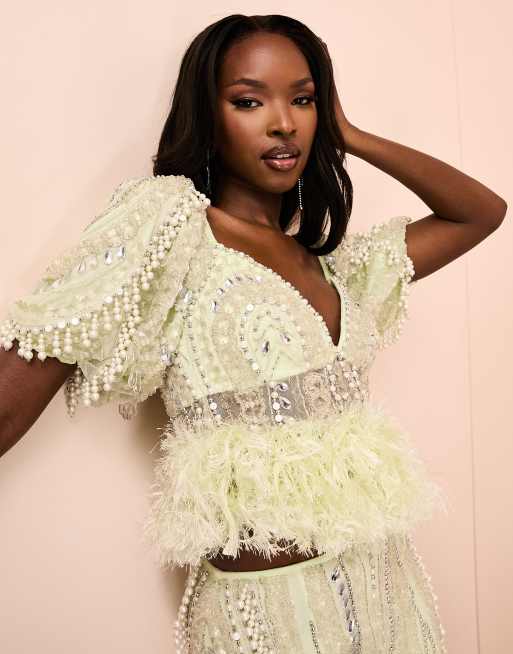 ASOS Luxe – Zielony top z bufkami zdobiony wiszącymi perełkami, część zestawu