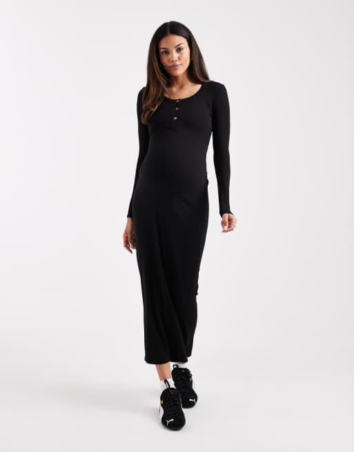 ASOS DESIGN Maternity – Czarna prążkowana sukienka midi z dekoltem U z guzikami i wiązaniem