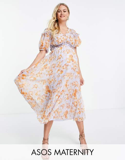ASOS DESIGN Maternity – Marszczona plisowana sukienka midi z bufkami w kwiatowy wzór