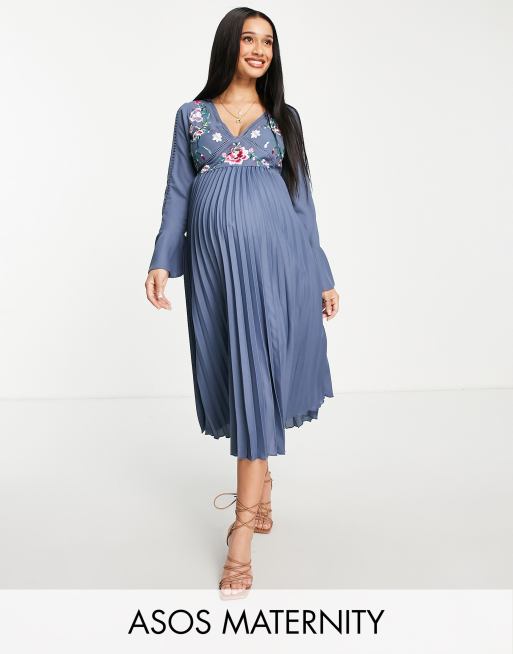 ASOS DESIGN Maternity – Niebieska plisowana sukienka midi z haftem
