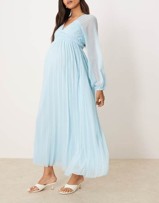 ASOS DESIGN Maternity – Pastelowoniebieska plisowana sukienka midaxi z głębokim dekoltem i długimi rękawami