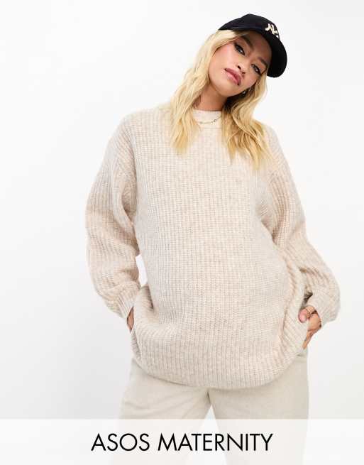 ASOS DESIGN Maternity – Puszysty prążkowany sweter z okrągłym dekoltem w kolorze owsianym
