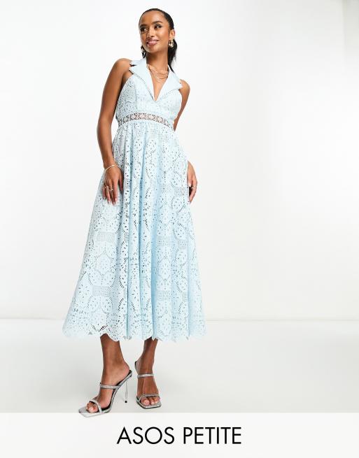 ASOS DESIGN Petite – Jasnoniebieska koronkowa sukienka midi z kołnierzykiem i odkrytymi plecami