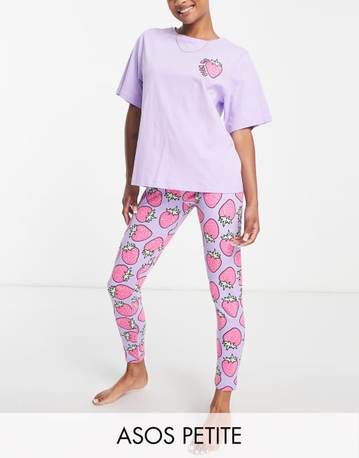 ASOS DESIGN Petite – Liliowa piżama w truskawki: koszulka oversize i legginsy