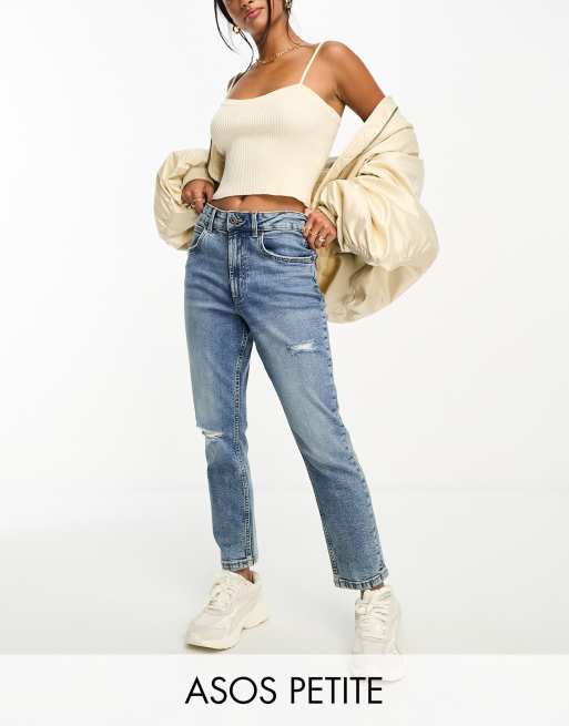 ASOS DESIGN Petite – Niebieskie wygodne mom jeans o dopasowanym kroju z przetarciami