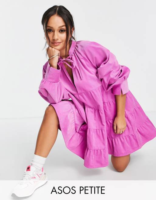 ASOS DESIGN Petite – Różowa sztruksowa sukienka kaskadowa mini o luźnym kroju