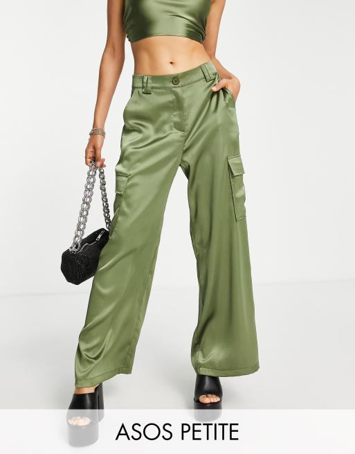 ASOS DESIGN Petite – Satynowe bojówki z szerokimi nogawkami w kolorze khaki, część zestawu