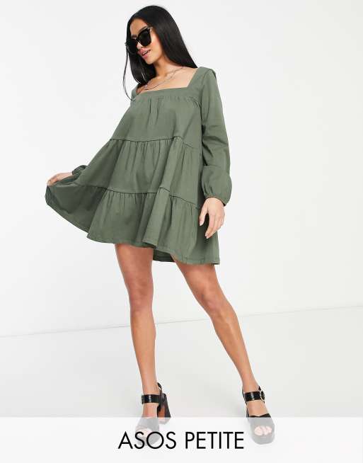 ASOS DESIGN Petite – Warstwowa luźna sukienka mini z dekoltem karo w kolorze khaki