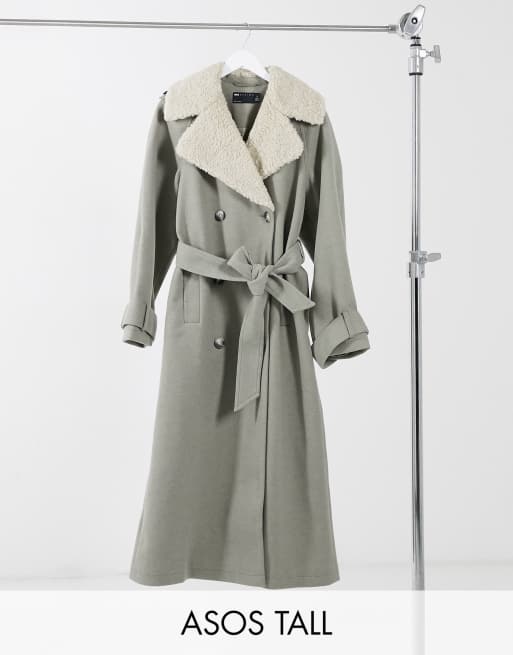 ASOS DESIGN – Płaszcz maxi z kołnierzem ze sztucznego kożuszka i paskiem, w kolorze pieczarkowym