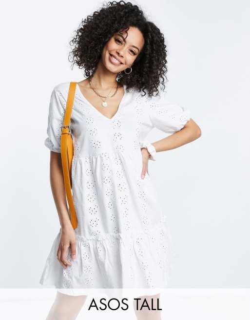 ASOS DESIGN Tall – Biała luźna sukienka oversize z bufkami, dekoltem w szpic i haftem angielskim