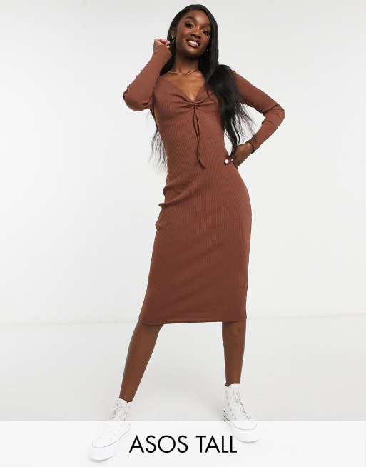 ASOS DESIGN Tall – Brązowa prążkowana sukienka midi z marszczeniem