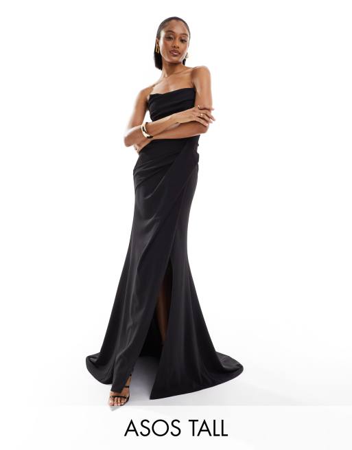 ASOS DESIGN Tall – Czarna sukienka premium maxi z drapowanym dekoltem bandeau i głębokim rozcięciem