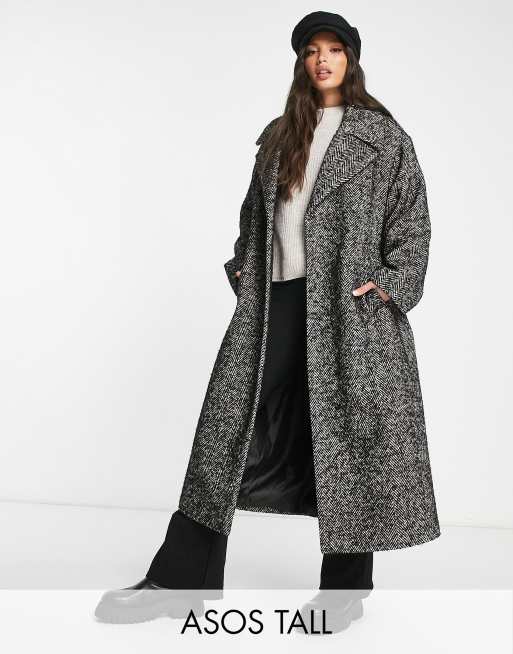 ASOS DESIGN Tall – Czarno-biały elegancki płaszcz z paskiem we wzór w jodełkę