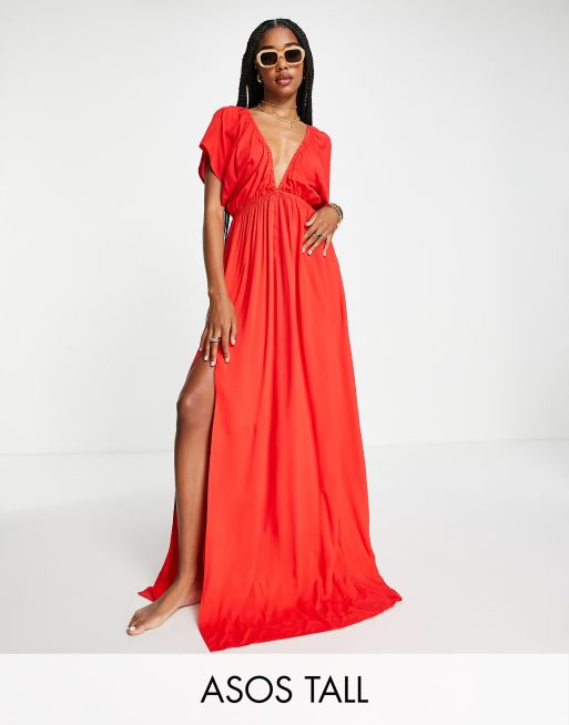 ASOS DESIGN Tall – Czerwona sukienka plażowa maxi ze zwiewnymi rękawami – RED