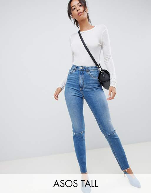 ASOS DESIGN Tall – Farleigh – Niebieskie, sprane jeansy mom o dopasowanym kroju z podwyższonym stanem i podartymi kolanami