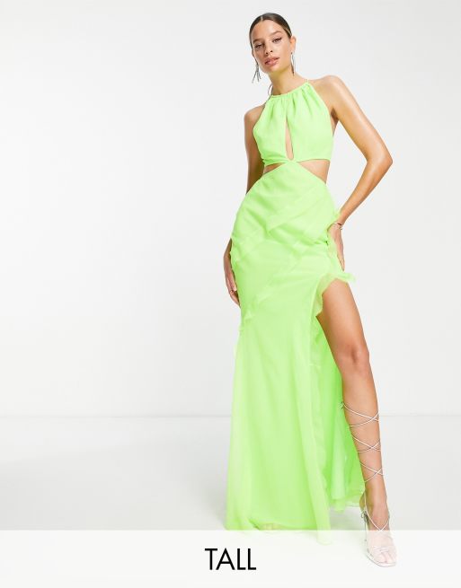 ASOS DESIGN Tall – Jaskrawozielona sukienka maxi ze skosu z dekoltem halter i falbanką