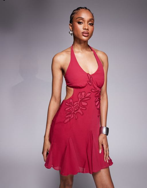 ASOS DESIGN Tall – Różowa sukienka mini z godetami, dekoltem typu halter i haftowanym wzorem