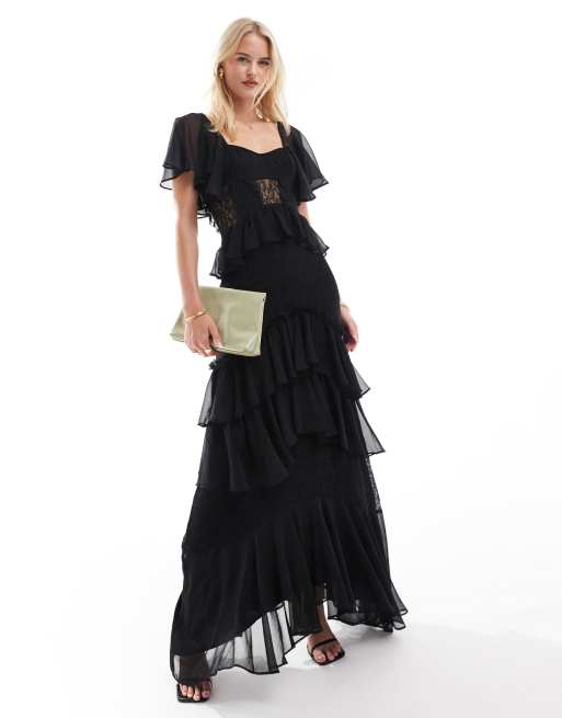 ASOS DESIGN Tall – Warstwowa czarna sukienka midi z rozkloszowanymi rękawami i koronkową wstawką