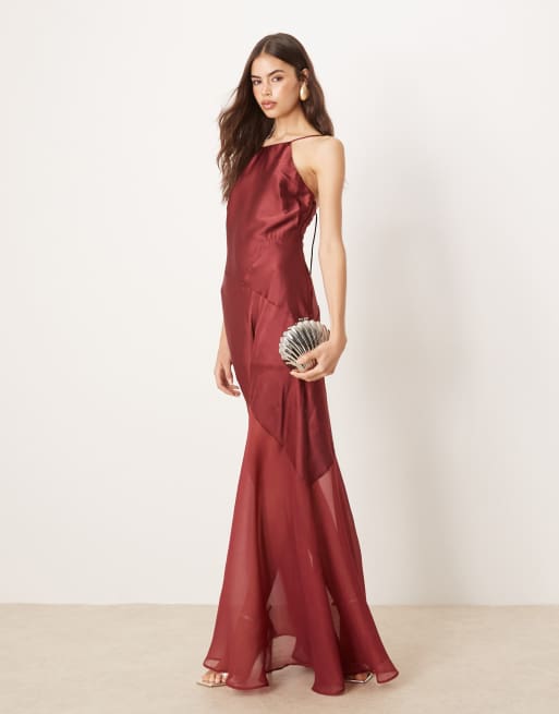 ASOS DESIGN Tall – Wiśniowoczerwona satynowa sukienka maxi z szyfonową spódnicą
