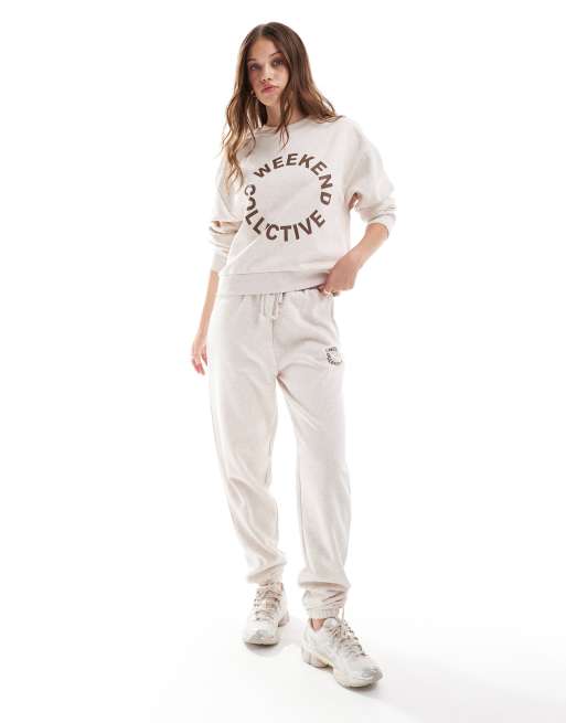 ASOS Weekend Collective – Jasnobeżowe joggersy z brązowym okrągłym logo, część zestawu