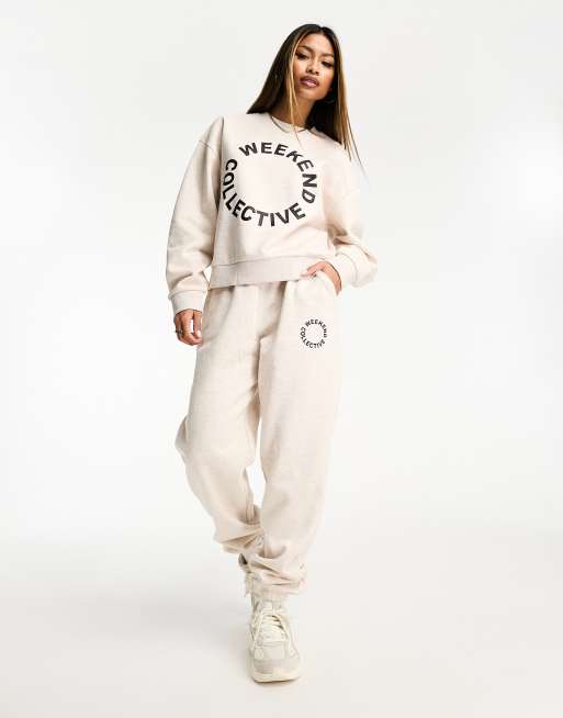 ASOS Weekend Collective – Jasnobeżowe melanżowe joggersy oversize z czarnym logo, część zestawu