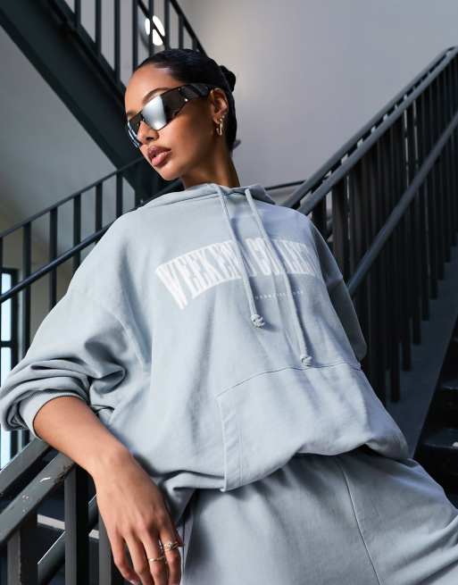 ASOS Weekend Collective – Niebieska bluza oversize z kapturem, efektem sprania i uczelnianym logo, część zestawu