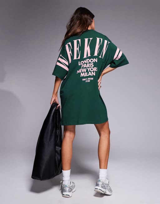 Weekend Collective – Zielona sukienka T-shirtowa oversize z logo na plecach