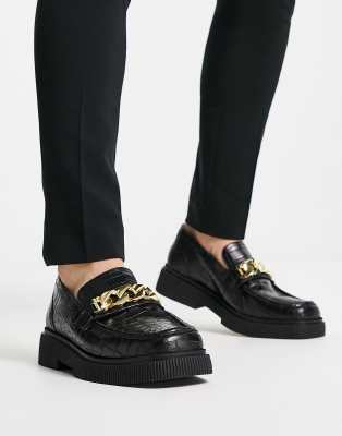 Asra – Farley – Czarne skórzane loafersy z kwadratowymi noskami, łańcuszkiem i krokodylim wzorem