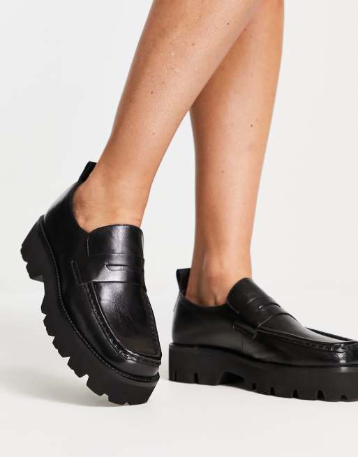 Asra – Farrel – Czarne skórzane loafersy z kwadratowymi noskami na masywnej podeszwie