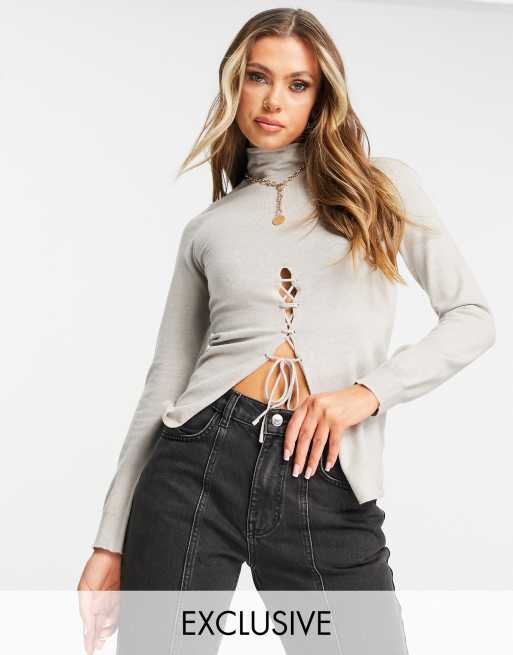 ASYOU – Szary sweter z odwijanym golfem i wiązaniem na przodzie