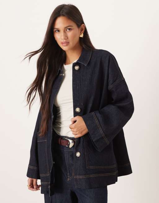 AWARE – Ciemnoniebieska kurtka jeansowa typu trucker o fasonie oversize i pudełkowym kroju