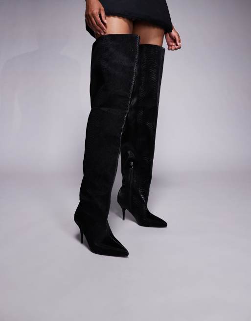 Azalea Wang – Halina – Czarne marszczone kozaki za kolano w wężowy wzór