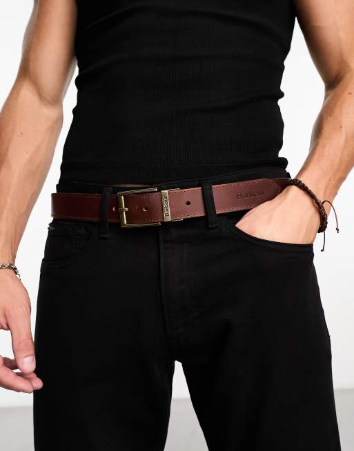 Barbour – Ciemnobrązowy dwustronny pasek ze skóry ze wzorem w szkocką kratę