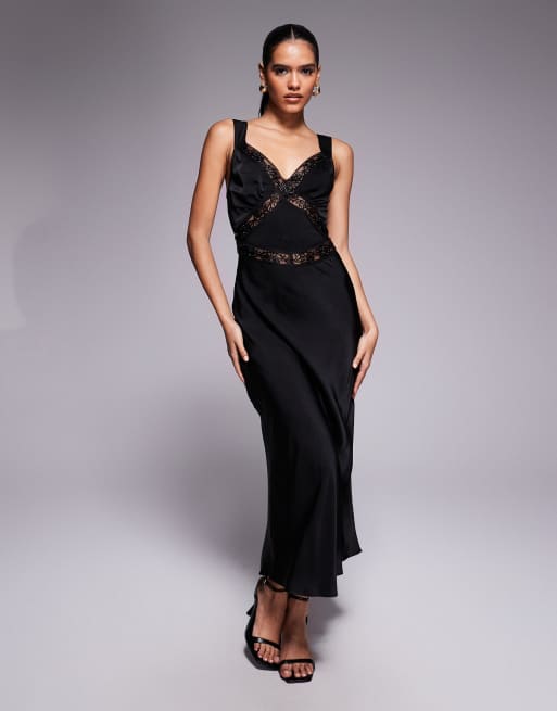 Bardot – Emory – Czarna sukienka midaxi z matowej satyny ze zdobionymi wstawkami